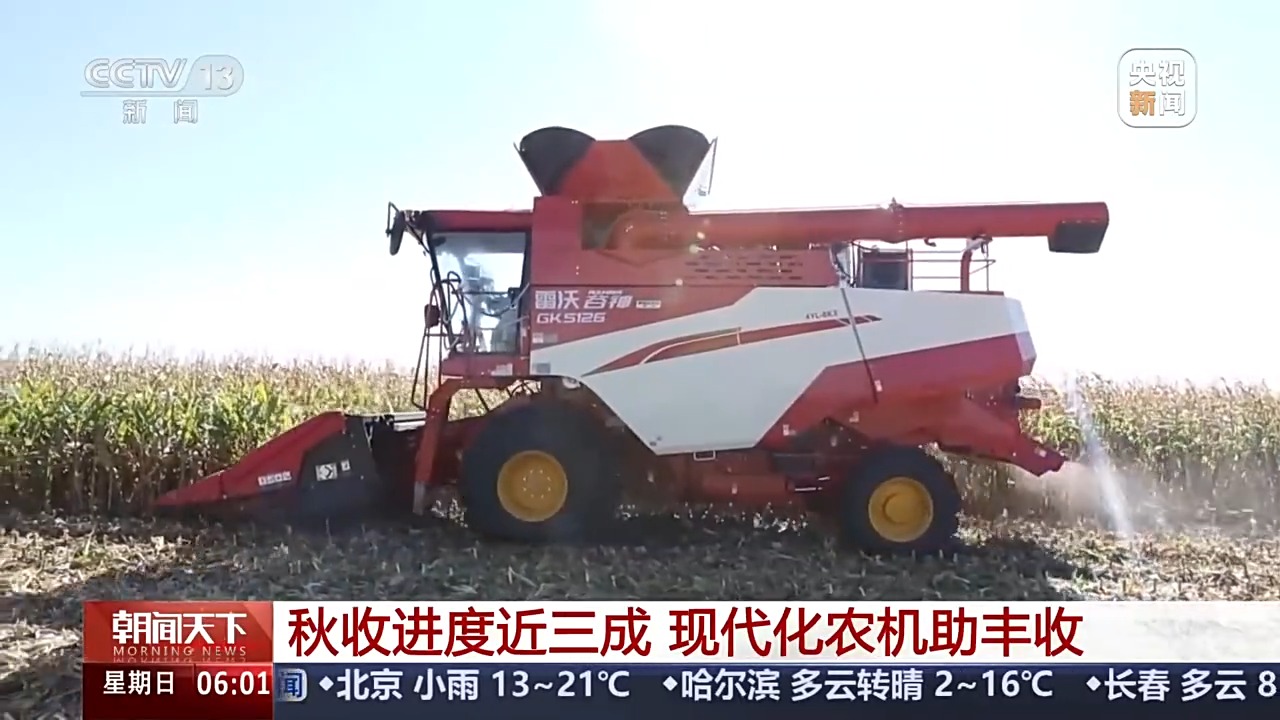 在黑龙江,当地2.2亿亩粮食作物长势整体好于去年,玉米、水稻、大豆成熟期同比提前了3—5天。北大荒投入一批新研制的大马力、大喂入量的收割机,加快了机收进度。